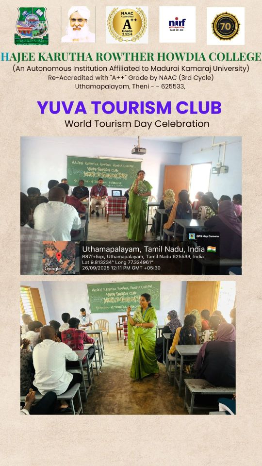 In order to celebrate the World Tourism Day, the Yuva Tourism Club of Hajee Karutha Rowther Howdia College, Uthamapalayam, Tamil Nadu organized a special Talk on the United Nations World Tourism Organizations theme, ‘Tourism and Sustainable Transformation’ on 26. 09.2025. Dr. M. Jannathul Firdhouse, Assistant Professor of Chemistry, Hajee Karutha Rowther Howdia College, Uthamapalayam served as the Resource Person of the programme. The event aimed to create awareness among students about sustainable and responsible tourism practices. In her address, Dr. Jannathul Firdhouse emphasized the need for sustainable tourism and highlighted how the tourism industry impacts the environment. Forty-five students benefited out of the programme.