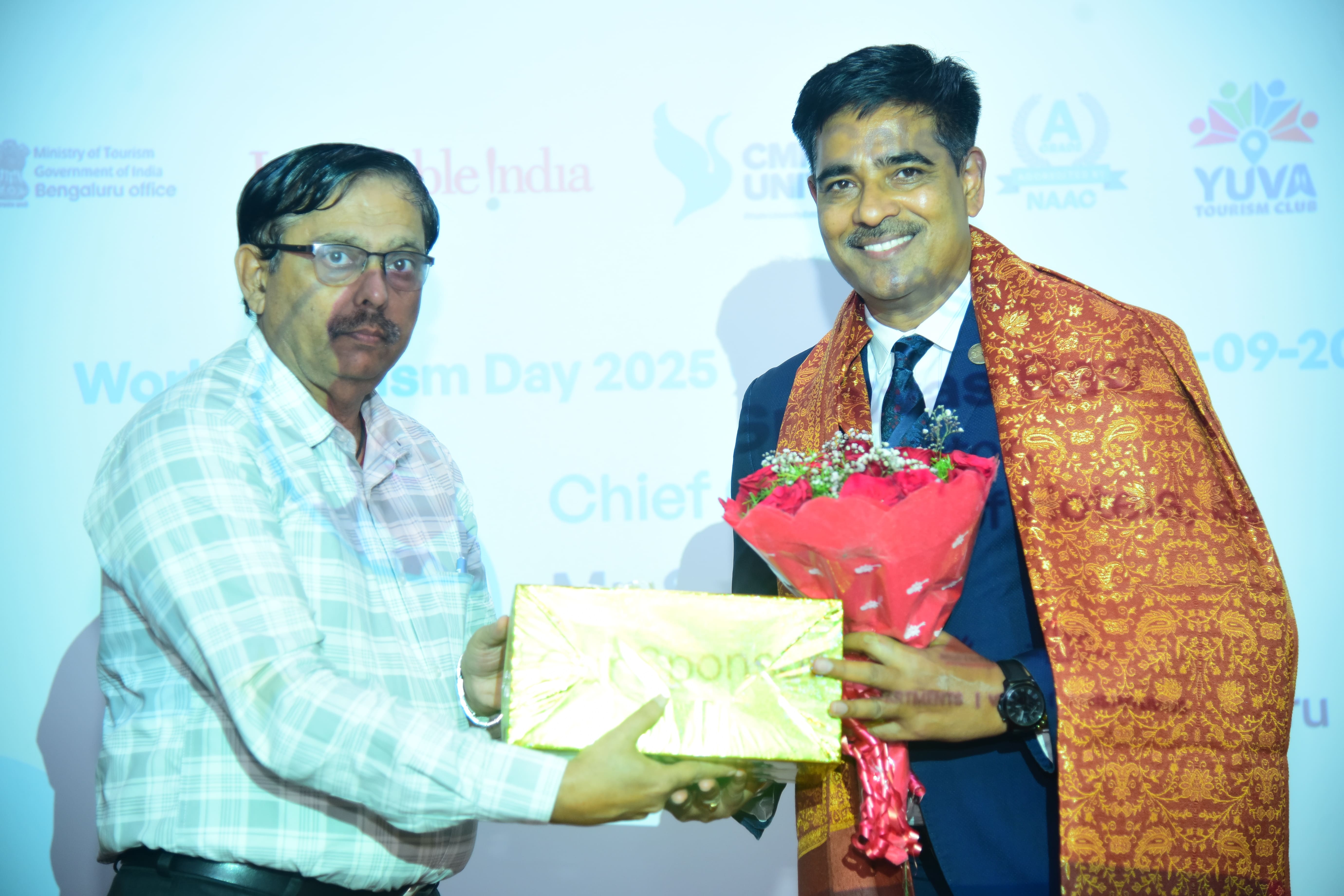 World Tourism day was celebrated at CMR University, City Campus by Yuva Tourism Club of School of Liberal studies on 25th September,2025 from 2,30 pm to 4.00 pm in AV Hall. The event was organised by Dr G Saravana Kumar Professor emeritus and Yuva Tourism club coordinator from School of liberal studies and Dr Latha Krishnan, Dean, SLS. The theme announced for this year by UN Tourism was Tourism and Sustainable Transformation. As part of the celebration we had 5 competitions namely Essay, world countries tourism painting , Poster making based on theme, Tourism Quiz and one minute reels (video) competition. The main event was conducted on 25th September and the Chief guest was Mr Srinivas Rao, Cluster Director HR of Hilton Manyata Group of Hotels. The event was presided by Dr HB Raghavendra Vice Chancellor of CMR University. Chief guest spoke on the opportunities in Hotel Industry and explained how students should equip themselves with additional skills and adapt themselves to new environment and work culture. Vice chancellor said it was first time World tourism day is being celebrated in CMR University and said in the next year it should be celebrated combining all campus of CMRU and appreciated the Yuva tourism Club,School of liberal studies for taking the initiative. The event also had the inaugural of Yuva Tourism Club which is sponsored by Ministry of Tourism and it was symbolically inaugurated by our Vice chancellor Dr HB Raghavendra and chief guest Mr Srinivas Rao in the presence of Dr Latha Krishnan Dean SLS. The event started with invocation Bharatha Natyam dance by Ms Deva Nanda of MSc Psychology 1 sem,which was on lord Rama and was very professional. It was followed by Welcome address by Dr Latha Krishnan, dean SLS and felicitation of chief guest by our Vice chancellor. We also had the investiture ceremony for Yuva club student members for whom badges were fixed by the dignitaries and they took a pledge for responsible traveller read by Dr G Saravana kumar, Yuva tourism club coordinator. There was a tourism cultural ramp walk showcasing 8 states of India performed by students of SLS actually native of the respective states with a commentary on the tourism and culture which was very colourful and appreciated by the audience. There was a hindi song performance by Ms. Debleena Msc Psychology 1 sem student. Prizes were distributed to all the winners of various competitions by the dignitaries along with certificates. Videos of competitions conducted, Malaysia host country and Karnataka tourism were played. Ministry of tourism had sponsored Yuva tourism club badges were fixed to Yuva tourism club members on stage and Pledge for responsible traveller was administered by Dr G Saravana Kumar Professor and Yuva Tourism club coordinator for CMR University to the student members and tourism brochures were issued to the students. The event ended with Vote of thanks by Dr G Saravana Kumar, Professor emeritus and Yuva tourism club coordinator, CMR University.